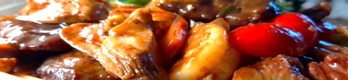 £7.40(Selection of meat and vegetables cook in garlic Hoi Sin Sauces) - Special Roast Chicken Fillet£7.40(Sliced deep fried roast chicken served with selection of meat an vegetables and topped with BBQ sauce)